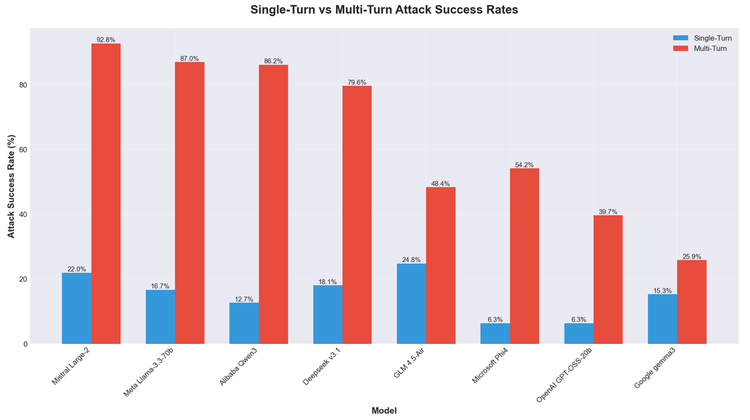Wie groß und real diese Gefahr trotz aller Anstrengungen der Modell-Entwickler noch immer ist, zeigt jetzt deutlich eine aktuelle Untersuchung von Cisco AI Defense auf. Dessen Experten nahmen sich acht der größten Sprachmodelle (LLMs) von OpenAI, Google, Microsoft, Meta und Co. zur Brust und untersuchten sie auf ihre Widerstandsfähigkeit gegenüber einfachen und mehrstufigen Angriffen. Dabei bestätigte sich über alle Modelle hinweg, dass sie sowohl noch immer erhebliche Schwächen gegenüber Single-Turn-Angriffen mit einzelnen Jailbreak-Prompts aufweisen, als auch, dass die Gefahr bei mehrstufigen Angriffen noch deutlich höher ist.