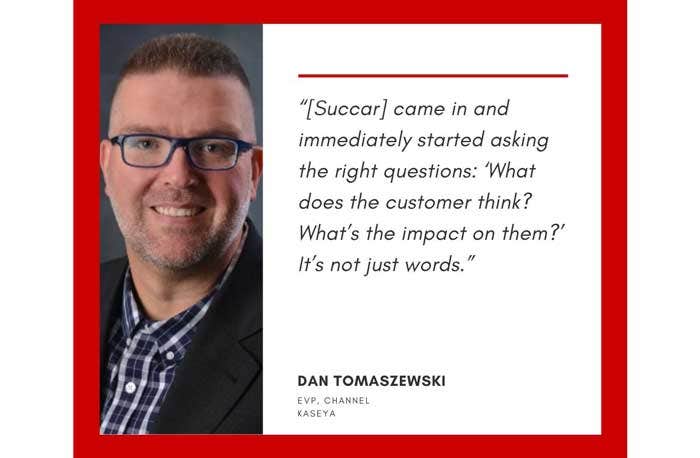 Unabhängig davon, wie sich die rechtlichen Auseinandersetzungen entwickeln, sagte Dan Tomaszewski, Channel-Chef bei Kaseya, dass die Verlagerung der Energie und Ausrichtung von Kaseya spürbar sei, von der Gesamtstrategie bis zur täglichen Umsetzung. "Succar kam und stellte sofort die richtigen Fragen: ‚Was denkt der Kunde? Welche Auswirkungen hat das auf ihn?’", erklärte Tomaszewski, Executive Vice President of Channel bei Kaseya, gegenüber CRN. "Das sind nicht nur Worte. Sie investiert in Dinge, die tatsächlich etwas bewirken, wie eine bessere Community-Plattform, mehr Ressourcen für die Umsetzung und die Unterstützung, um diese kundenorientierten Ideen zu verwirklichen."