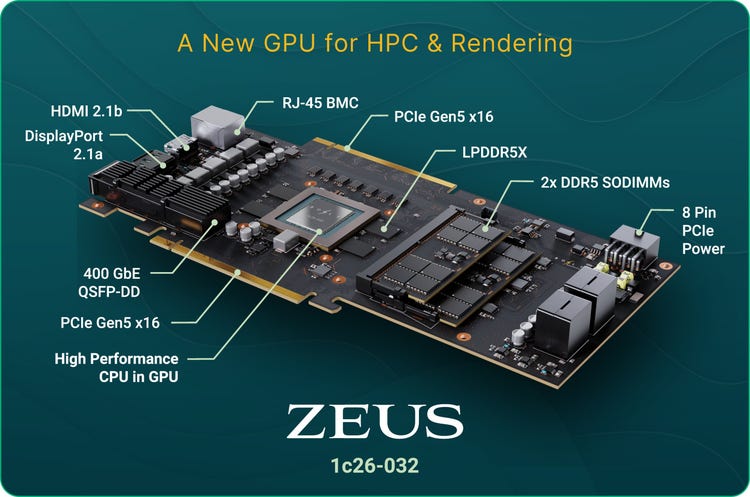 Deutlich größer ist der Rückstand indes bei der gerade für den Gaming-Einsatz ebenso wichtigen Rasterisierung, bei der Zeus mit angeblich 20 Teraflops deutlich hinter den 56 Teraflops der RTX 5080 liegt. Zumindest einen Teil davon könnte Bold jedoch auf anderem Wege ausgleichen. Da der Chip mit herkömmlichem DDR5-Arbeitsspeicher statt des speziellen GDDR-RAM für Grafikkarten setzt, verfügt er zwar nur über eine geringere Speicherbandbreite, kann dafür aber laut Hersteller auf Grafikkarten über zwei Steckplätze beliebig mit bis zu 160 GB aufgerüstet werden.