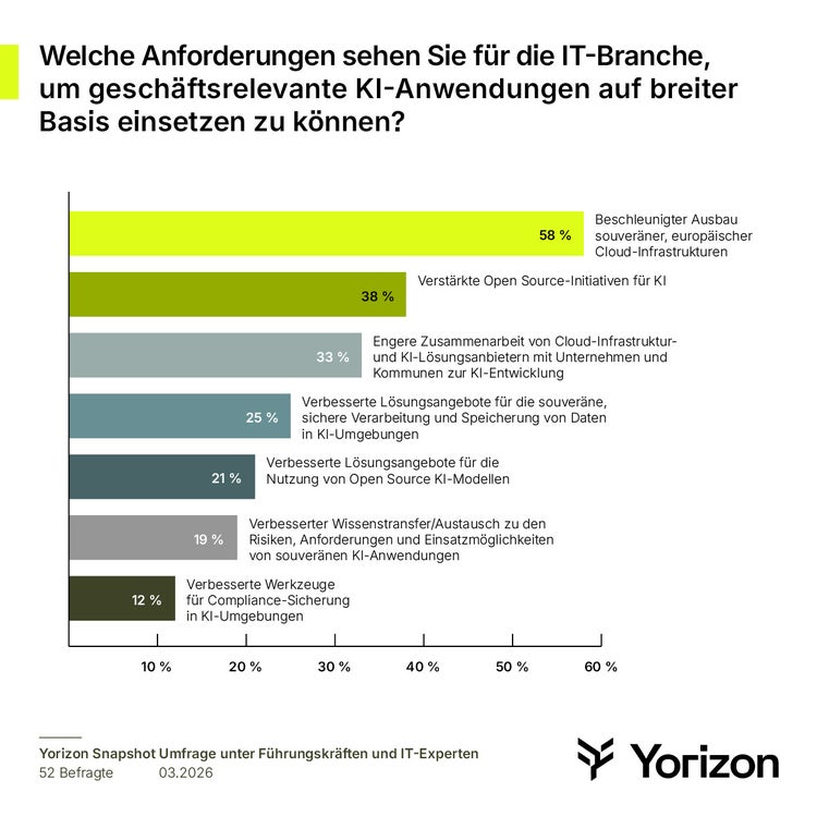 In diesem Sinne fordern auch 58 Prozent der Befragten von der IT-Branche den Ausbau souveräner europäischer Cloud-Infrastrukturen und 38 Prozent verstärkte Open-Source-Initiativen im KI-Bereich. Zudem wünschen sie sich verbesserte souveräne Lösungsangebote und eine engere Zusammenarbeit mit den Dienstleistern und Herstellern. Gefragt sind bei den Unternehmenskunden also souveräne Plattformen, welche die nötige Kontrolle, Sicherheit, Compliance und Transparenz gewährleisten.