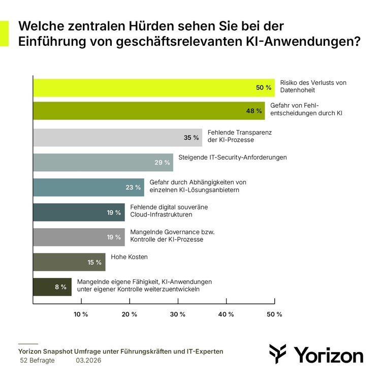 Eine Einschätzung, die auch viele auf dem Cloudfest 2026 anwesende Verantwortliche teilten. In einer Snapshot-Umfrage, die der Cloud-Anbieter Yorizon während der Veranstaltung durchführte, nannte die Hälfte der 52 befragten IT-Experten und Führungskräfte das Risiko des Verlusts der Datensouveränität als größte Hürde bei der Einführung geschäftsrelevanter KI-Anwendungen. Fast genauso viele (48 Prozent) fürchten sich außerdem vor Fehlentscheidungen der KI und ihren Konsequenzen. Es folgen die fehlende Transparenz der KI-Prozesse (35 Prozent), die steigenden Security-Anforderungen (29 Prozent) sowie die Gefahr der Anhängigkeit von einzelnen KI-Lösungsanbietern (23 Prozent). Indes bereiten die notwendigen Kompetenzen und der im KI-Bereich besonders große Fachkräftemangel den Unternehmensvertretern keine nennenswerten Sorgen: Nur acht Prozent zweifeln an der Fähigkeit ihrer Organisation, KI-Anwendungen unter eigener Kontrolle weiterzuentwickeln.