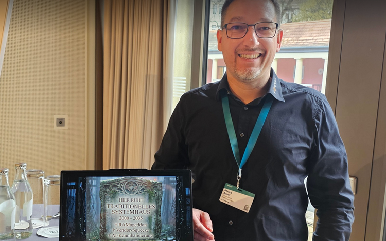 Schröder und Vorstandskollege Miguel Rodriguez (zuständig für Zentralbeschaffung und Logistik) sehen im Großen und Ganzen keine Bedrohung der Geschäftsmodelle ihrer Mitgliedsunternehmens durch KI oder etwas der aktuellen Krise auf dem Komponentenmarkt. Verzögerte Hardware-Projekte können mache IT-Häuser zwar vor Herausforderungen bei der Liquidität stellen. Die meisten Systemhäuser aber sichern ihre Einnahmen durch länger laufende Service-Verträge ab. Ein RAMageddon, wie Totengräber Marko Bauer von Fornax auf dem Grabstein des klassischen Systemhauses digital (und per KI) eingraviert, sehen die Manager nicht. Im Gegenteil: Rodriguez sieht ein boomendes Hard- und Softwaregeschäft. Mehr als 1,3 Mrd. Euro Umsatz erzielt Synaxon über den Zentraleinkauf Egis. Dass Synaxon der VMware-Konsolidierung des seines VCSP-Partnerkanals zum Opfer gefallen ist, bedauert er zwar. Sonderlich erschüttert gibt sich Rodriguez nicht.
