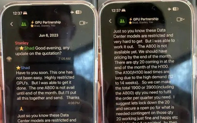 Wie diese Screenshots zeigen, erklärte English in einer der ersten Nachrichten direkt, dass die GPUs stark eingeschränkt und schwer zu bekommen seien, und schrieb: "Das Einzige, was ich verlange, ist, dass nichts Illegales passiert, und ich will das schriftlich." In derselben Nachricht deutete er zugleich aber auch an, dass seine Firma ein Vertriebspartner von Company-1 (Supermicro) ist, als er ausführte: "Ich sage nicht, dass es illegal ist. Aber die Chips sind wertvoller als Gold, und sie sind sehr streng, wer sie bekommt. Und ich kann es mir nicht leisten, meine Partnerschaft mit ihnen zu verlieren und meine Firma zu gefährden."