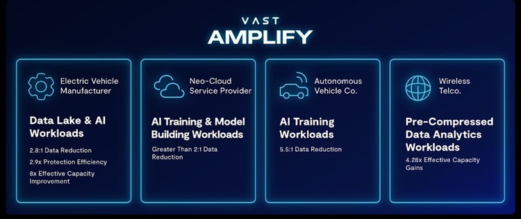 Zum Beleg führt Vast einige Kundenbeispiele aus der Praxis auf. Demnach soll Amplify einem Hersteller von Elektrofahrzeugen etwa eine Datenreduktion im Verhältnis von 2,8 zu 1 ermöglicht haben, kombiniert mit einer um den Faktor 2,91 höheren Effizienz gegenüber redundanter Datenreplikation. Die nutzbare Kapazität für Data-Lake- und KI-Workloads soll dabei knapp um den Faktor gesteigert worden sein. Bei einem Neo-Cloud-Service-Provider, der KI-Trainingsumgebungen für Modellentwickler hostet, verzeichnete Vast eine konsistente Datenreduktion im Verhältnis von 2 zu 1. Noch eine Stufe größer war der Effekt bei einem Anbieter autonomer Fahrzeuge, der bei seinen KI-Trainingsdaten eine Reduktion im Verhältnis von 5,5 zu 1 erreichen konnte. Ähnliches gelang bei einem Wireless-Telekommunikationsunternehmen, das seine ORC-Daten bereits vorkomprimiert speichert. Dennoch konnte hier laut Vast allein durch die Eliminierung der redundanten Datenreplikation für Datenanalysen eine Netto-Kapazitätsverbesserung um den Faktor 4,28 erzielt werden.