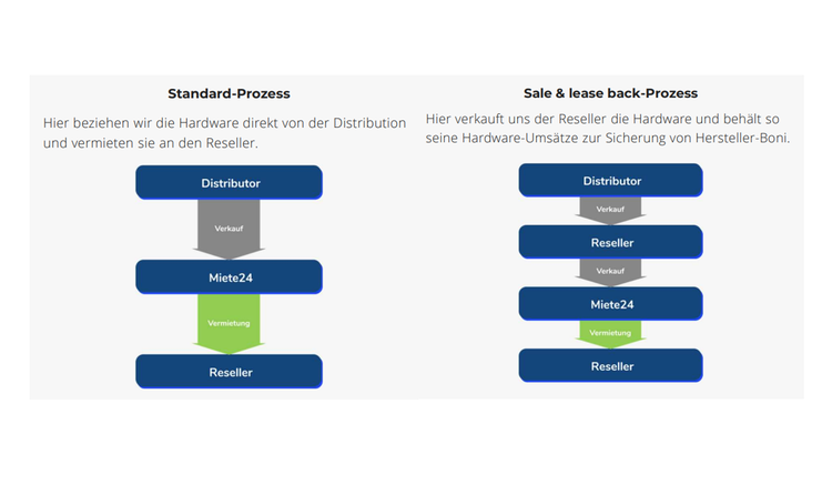 Anders als im Endkundenkanal gibt es bei Mietmodellen im Channelvertrieb einiges zu beachten. In der B2B-Lieferkette sind Distributoren zwischengestaltet. Die kann und will Miete24 auch gar nicht umgehen, im Gegenteil. Miete24 im B2B-Handel funktioniert vertragsrechtlich nach dem Sale-and-Lease-back-Verfahren: Distribution verkauft an Reseller, Reseller verkauft an Miete24, Miete24 vermietet an Reseller (siehe Grafik). Vorteil: Die Umsätze mit Herstellern sowohl der Distribution als der Reseller werden den Partnern zugeschrieben, die Hersteller-Boni damit gesichert. Das zweite Modell, der Standard-Prozess bei Miete24: Distribution verkauft an Miete24, Miete24 vermietet an Reseller.